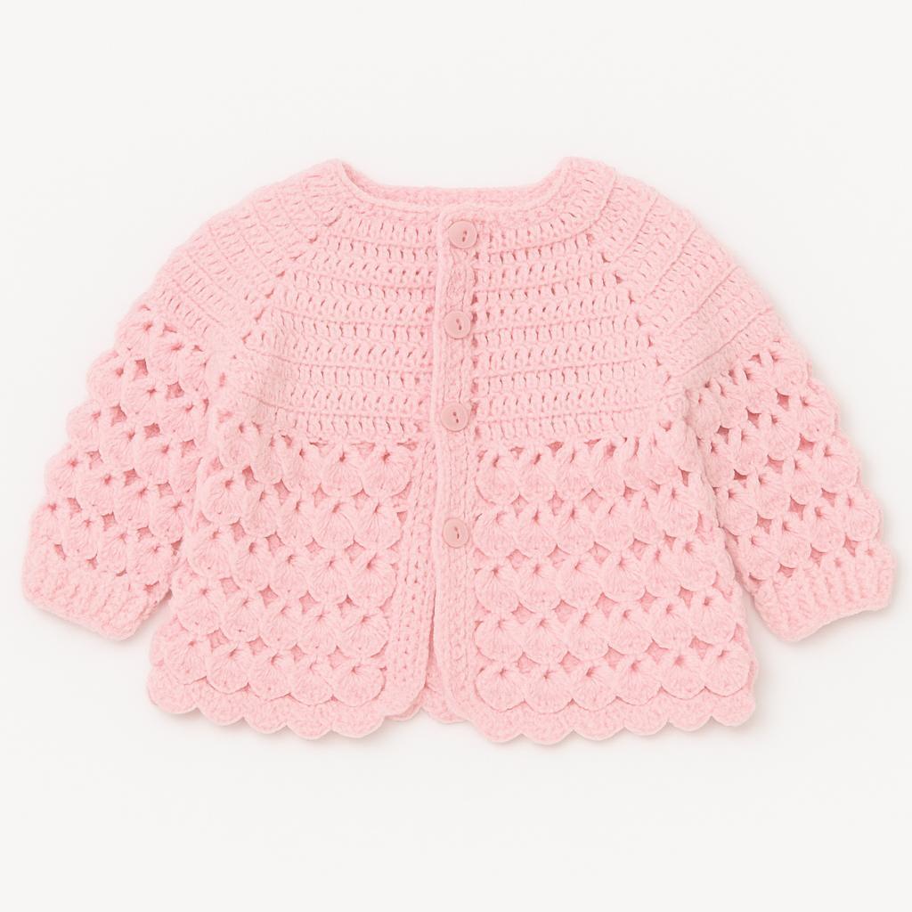 Esse casaquinho é uma verdadeira peça de afeto e cuidado. Confeccionado em crochê artesanal, em tom rosa bebê suave, possui fechamento frontal com botões e barrado ondulado, trazendo um ar romântico e nostálgico à peça.