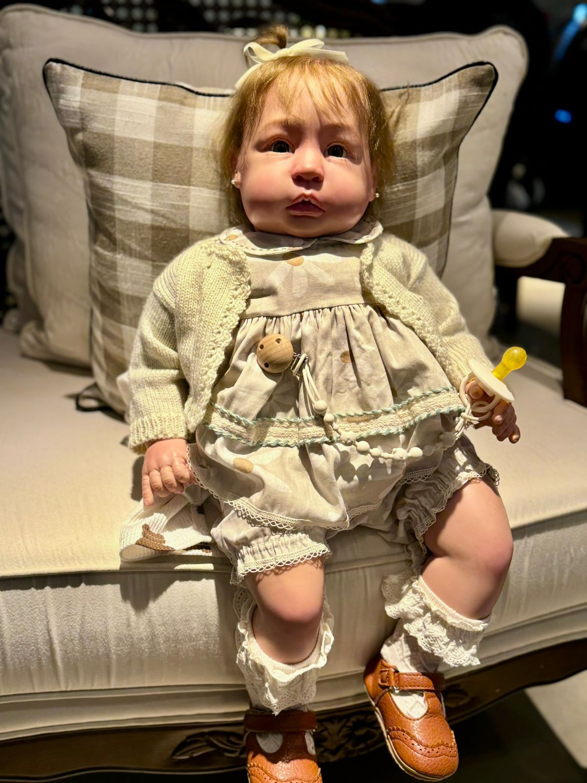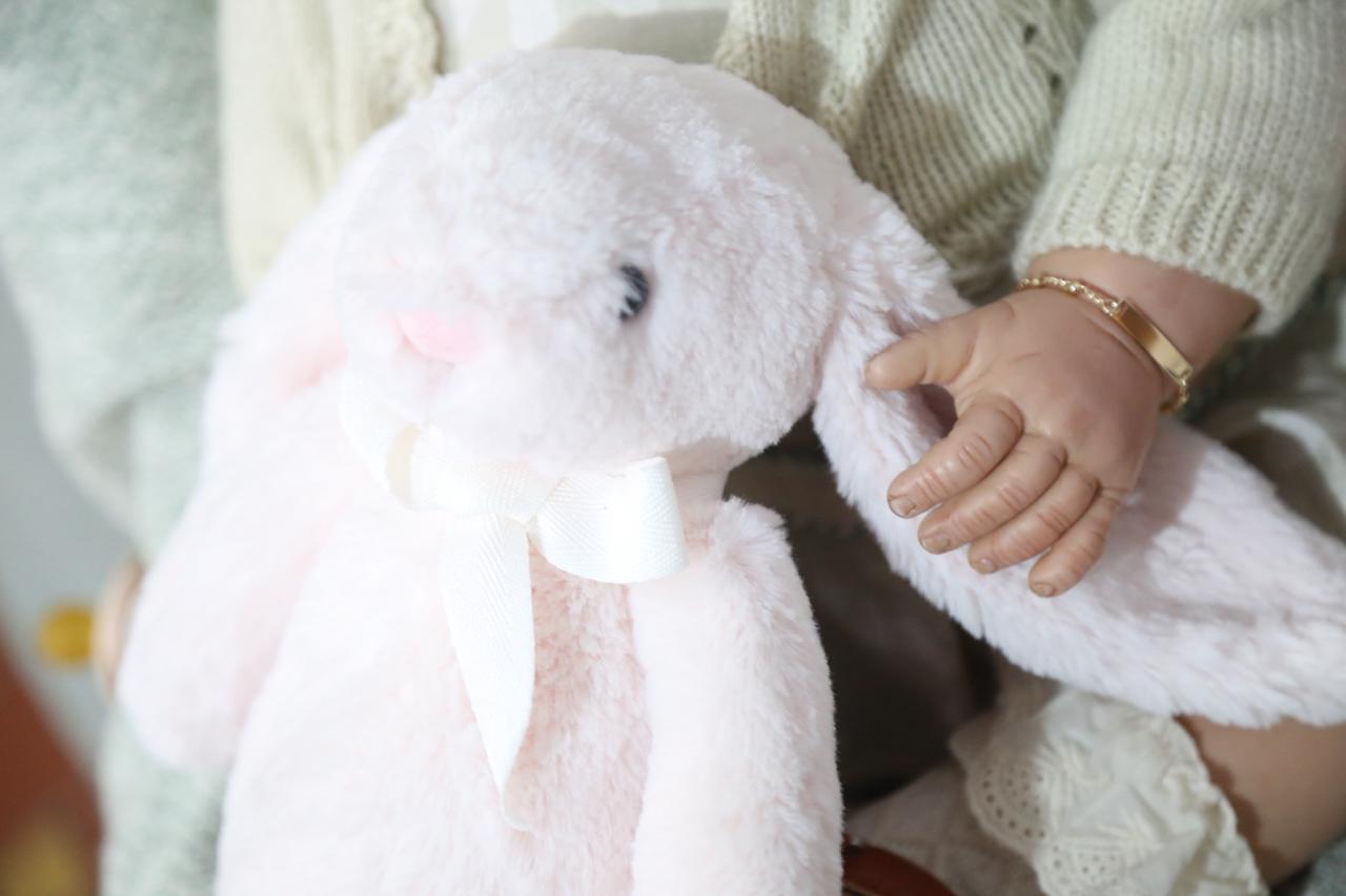Criada com um molde importado inspired e utilizando exclusivamente materiais importados de alta performance, Charlotte reflete todo o cuidado e perfeccionismo de um trabalho artesanal. Seu cabelo, feito de mohair ultra premium, foi implantado fio a fio, proporcionando uma textura macia e natural. Seu corpo é preenchido com materiais de qualidade para oferecer um peso realista, totalizando 3,8 kg, perfeito para carregar nos braços e sentir o aconchego de uma bebê de verdade.