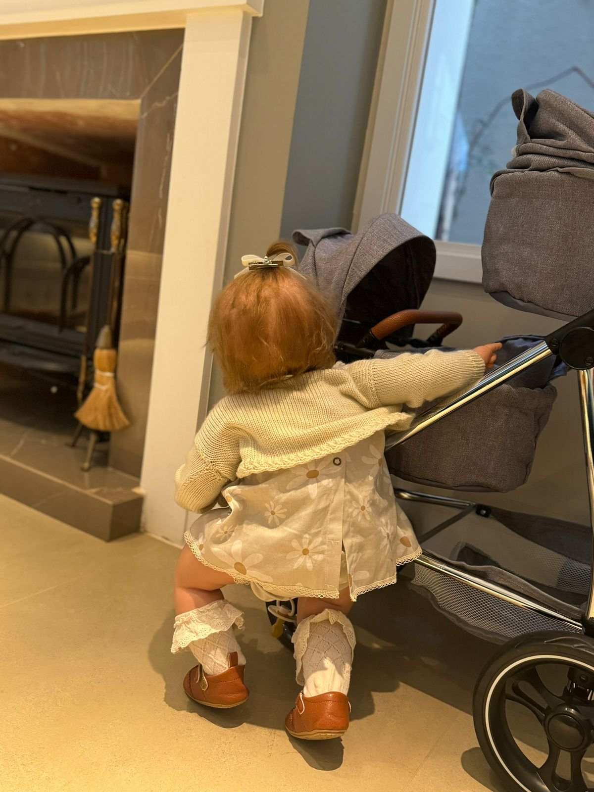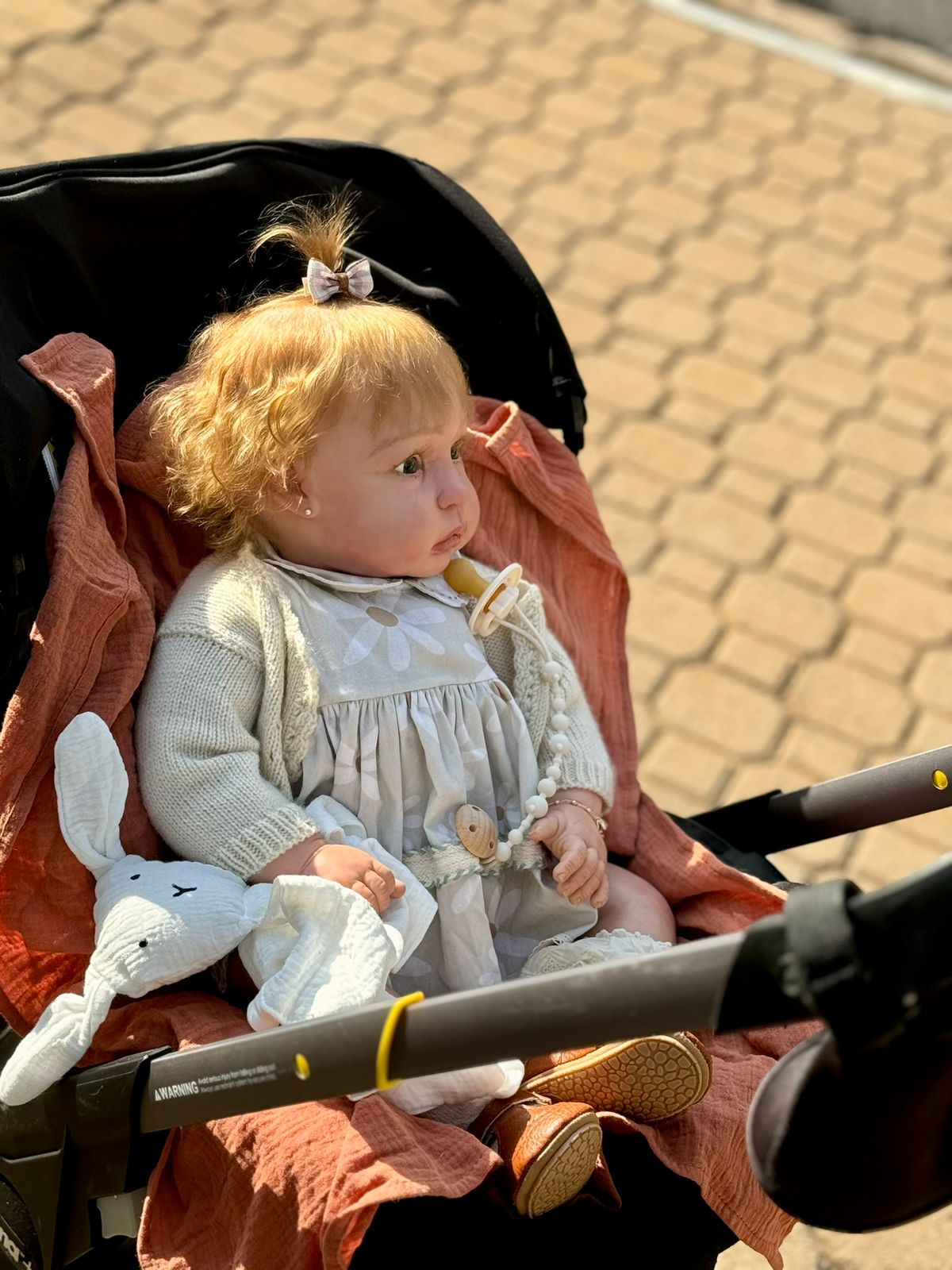 Vestida com um look clássico e delicado, ela traz um laço no cabelo e roupinhas premium cuidadosamente escolhidas para combinar com sua essência encantadora.