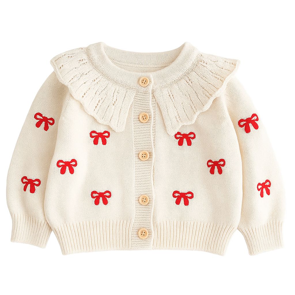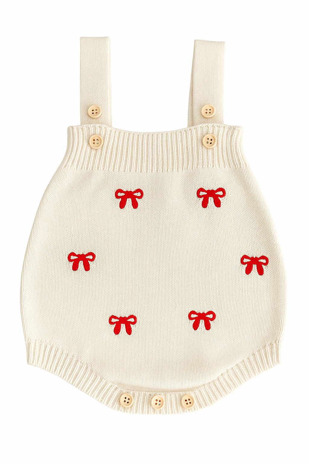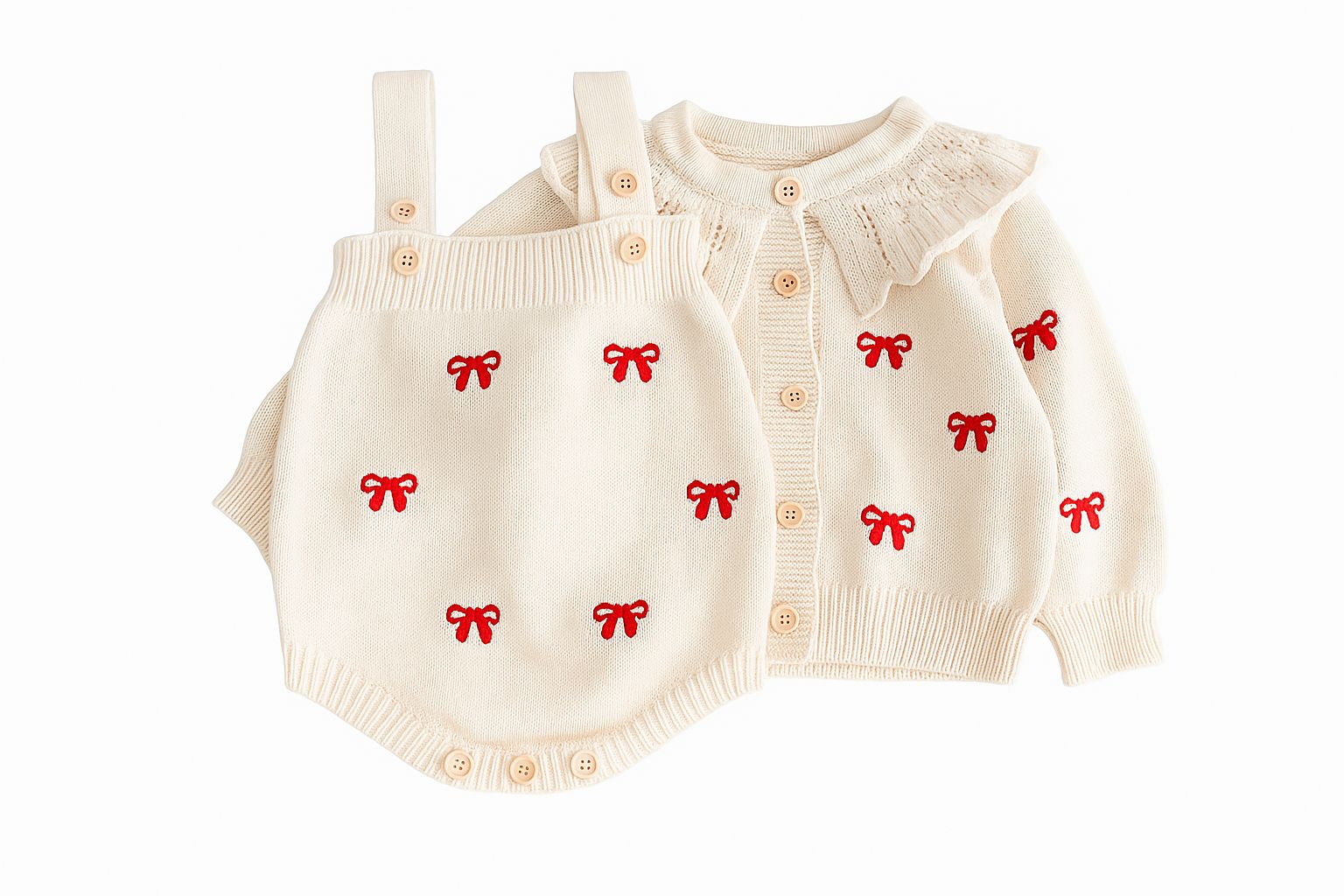 Esse conjunto em tricô é composto por duas peças que se completam: uma jardineira com botões de madeira e bordados de laços vermelhos, e um casaquinho com gola rendada e abotoamento frontal.