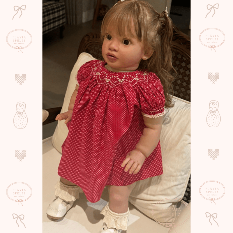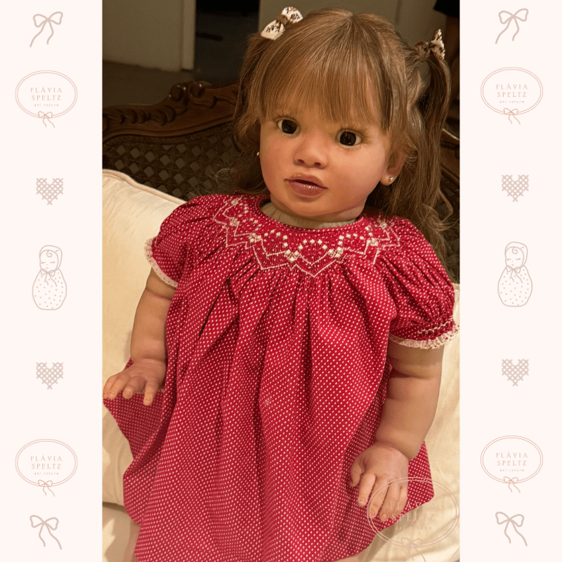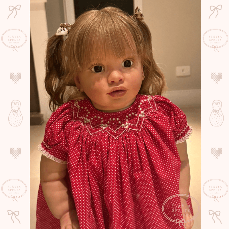 Pippa é uma boneca única, projetada para encantar com sua presença marcante. Com 66 cm e peso de 4,8 kg, Pippa é mais que uma boneca: é quase como ter uma criança em casa. Criada a partir de um molde especial, ela foi cuidadosamente confeccionada com cabelo humano, implantado fio a fio, proporcionando um realismo incomparável.